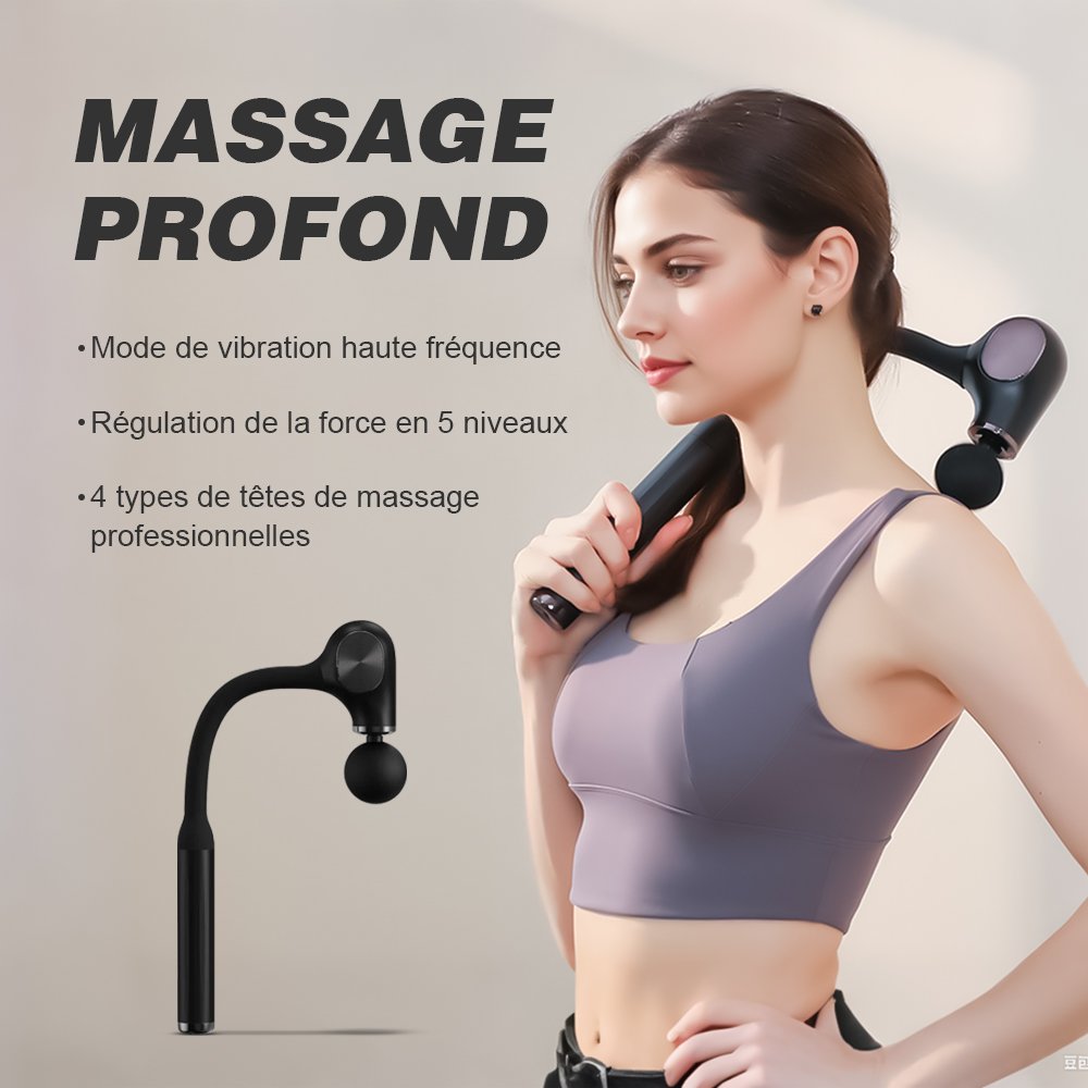Ce pistolet de massage dispose de cinq niveaux de régulation de la force, vous permettant de personnaliser votre massage en fonction de vos besoins spécifiques. Que ce soit pour une récupération post-entraînement, un relâchement des tensions musculaires ou une relaxation générale, vous avez le contrôle total d’intensité. L’appareil vient également avec quatre têtes de massage professionnelles, chacune conçue pour cibler des zones spécifiques du corps. Cela vous permet de diversifier vos sessions de massage pour une efficacité optimale.